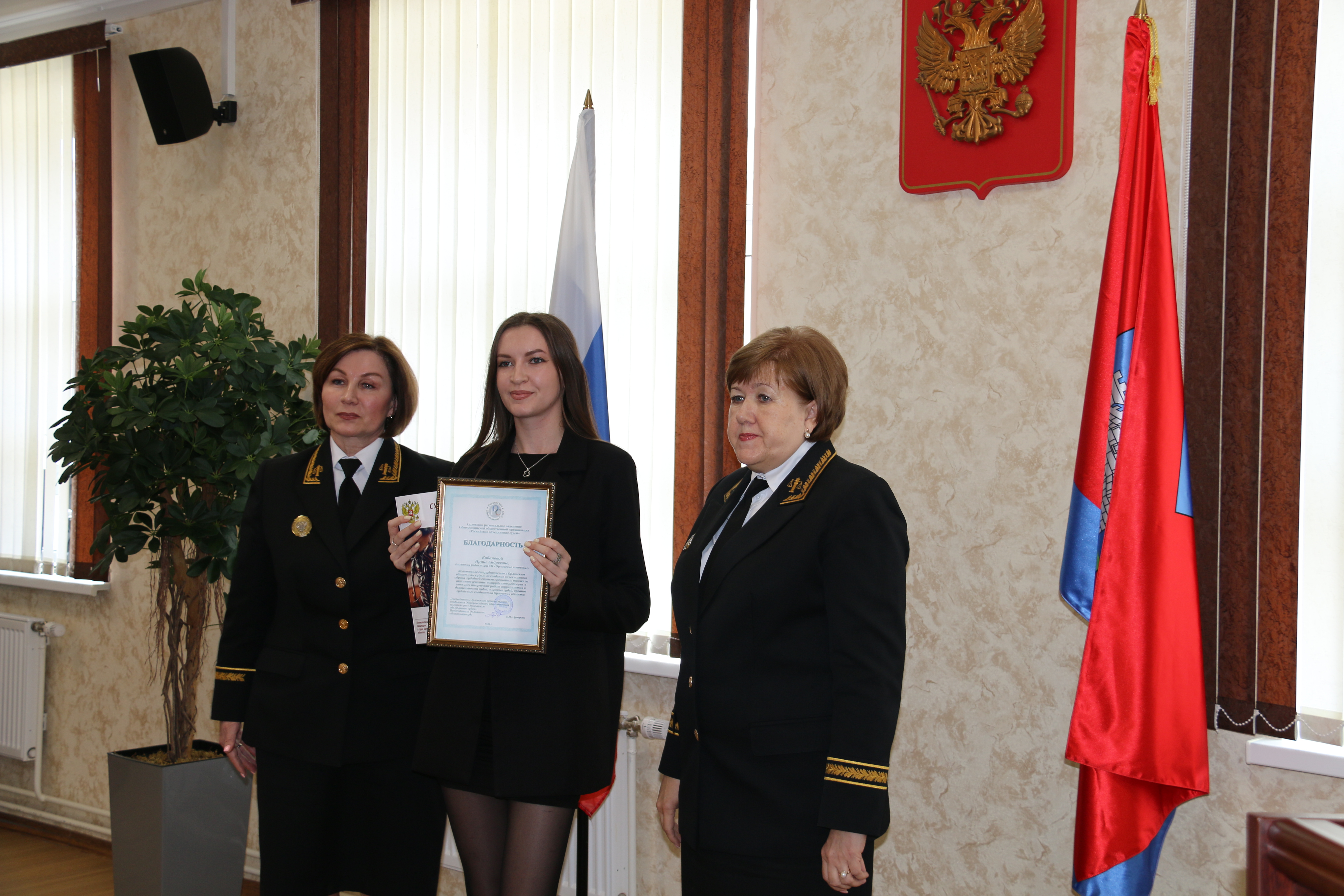 Кроме того, за активное сотрудничество с Орловским областным судом, за создание объективного образа судебной системы региона, а также за активное участие сотрудников редакции в проводимом конкурсе творческих работ журналистов, вручены благодарности Орловского отделения Общероссийской общественной организации «Российское объединение судей»: