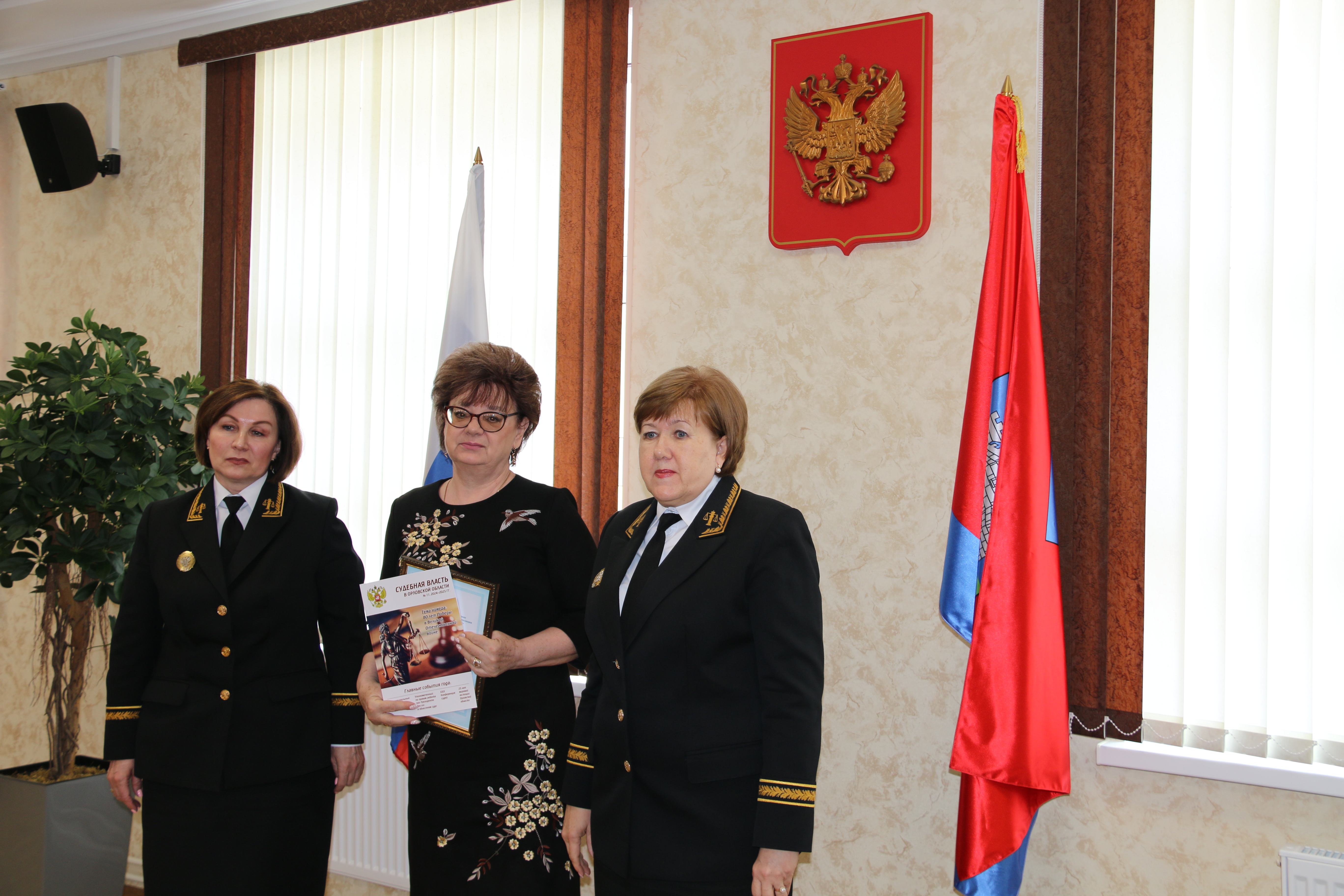 Заслуженные награды представителям СМИ вручали председатель Орловского областного суда Е.Н. Суворова и председатель совета судей Орловской области М.А. Угланова.