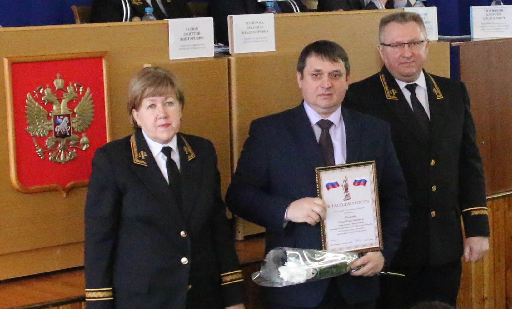 Председатель Орловского областного суда Е.Н. Суворова и председатель совета судей Орловской области Д.В. Сопов в торжественной обстановке за большой вклад в развитие правосудия и судебной системы объявили благодарность совета судей Орловской области: 1. Полухину Олегу Вячеславовичу – заместителю председателя Ливенского районного суда Орловской области;